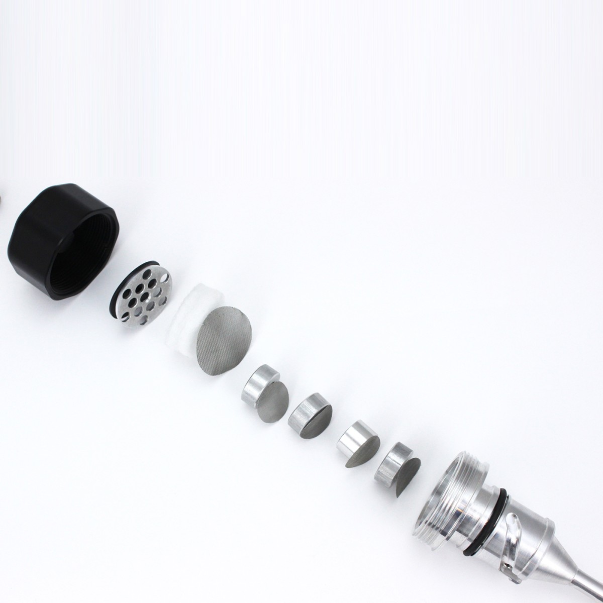 Softail Dipstick oil separator: The oil separator inserts into the inner dipstick housing bore, alternating the ¾” OD perforated screens and spacers then the large perf screen, filter, aluminum perforated disc then umbrella valve. The smaller diameter spacer is the 2nd from bottom, the umbrella valve sits on top.
