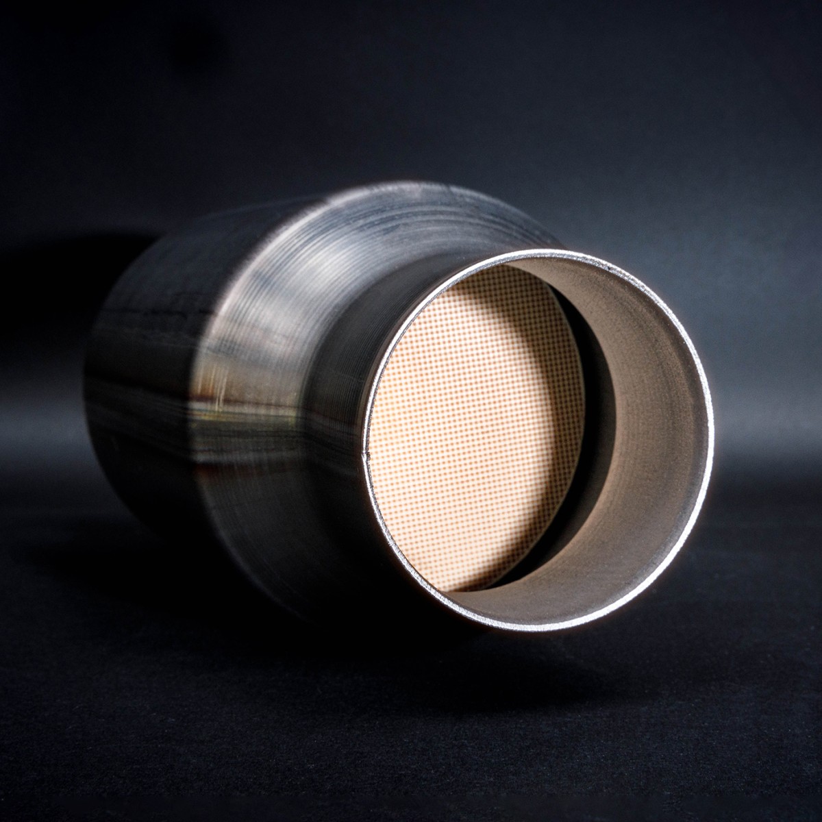 Inserts (Patent #5,173,576): Another patented technology dated back to the early 90’s. Designed to minimize drone / “hollow” noise common in straight through mufflers and absorb high pitch frequencies, producing a unique deep tone while maintaining inertia. Provides excellent low to mid-range torque and a signature high RPM note. The baffles are wrapped with stainless mat then fiberglass packing to extended packing life. Muffler is finished with a high-flow billet end cap, tapered on the inside for optimal flow and sound. Catalytic Converter in inlet of muffler.