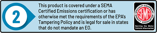 “Qualified Manufacturer Declared 49-State Federal Emissions Compliant Part” (Not legal for sale or use in California) means any aftermarket part intended to replace an original equipment emissions-related part and that meets all EPA emission regulations by installing the element of design in all emissions-related respects to the certified configuration of the vehicle, engine, or piece of equipment. This manufacturer has declared in writing that it has fully documented the emissions testing of an appropriate test vehicle, engine, or piece of equipment that had been identically altered and that the part meets all applicable emissions standards for that make/model/year fitment(s) advertised