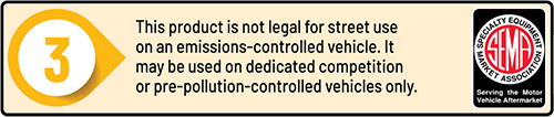 Parts designated as “Race Only” are for use only on vehicles used for competition racing and are not for use on vehicles registered for use on public roads. Sale and/or installation of “Race Only” parts in any way inconsistent with this warning is prohibited and may result in enforcement by the U.S EPA under the federal Clean Air Act. “RACE ONLY” PARTS ARE NOT LEGAL FOR SALE IN CALIFORNIA ON ANY POLLUTION CONTROLLED MOTOR VEHICLES.