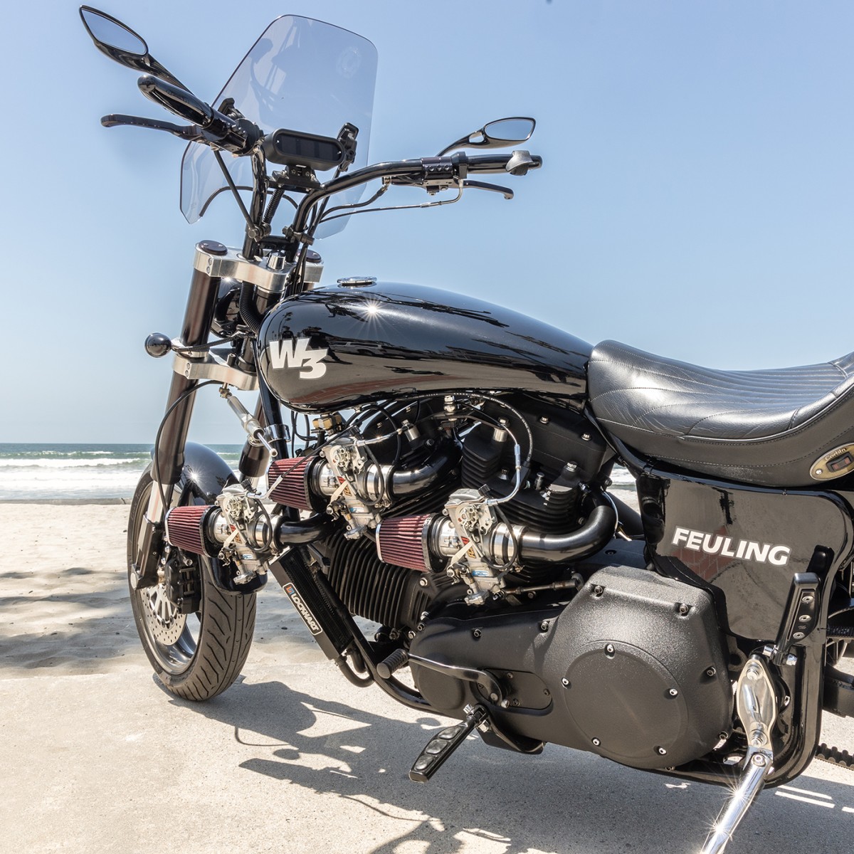 The W3® is a three cylinder W configuration engine. Air cooled, two-valve, triple gear driven cam, with a 4” bore and 4”stroke creating a 150 cubic inch monster. The engine is based on the Harley Twin Cam engine with majority of it's components interchangeable. The W3 uses its cubic inch to create the power thus keeping the package very reliable. The three-cylinder arrangement provides inherent smoothness firing at 90 degrees, and the low center of gravity is perfect for motorcycles.