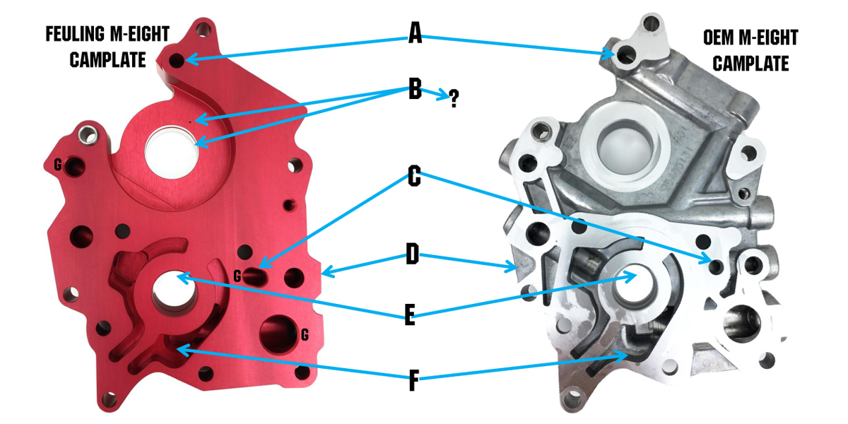 - G = FEULING HAS LARGE CHAMFERS ON PASSAGES ENTERING INTO CAMPLATE FOR A SMOOTH TRANSITION, OEM HAS SHARP EDGES