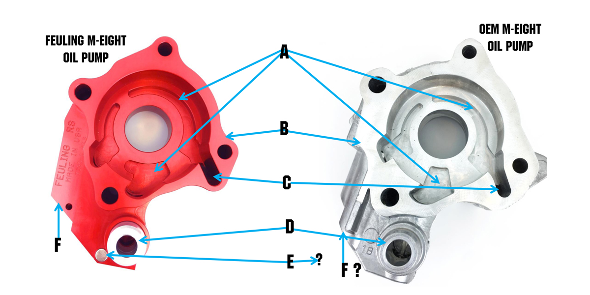 - A = Feuling pumps HAVE larger deeper kidney ports, ON BOTH PRESSURE AND SCAVENGE WITH LARGER DIAMETER HIGHFLOW GEARS