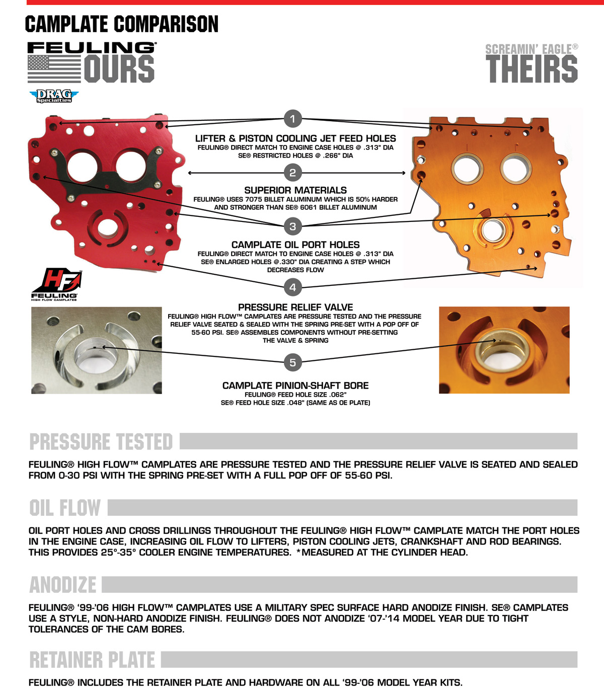 - D = FEULING CAMPLATES MACHINED FROM BILLET 7075 ALUMINUM WHICH IS 50% HARDER AND STRONGER THAN THE OEM CAST