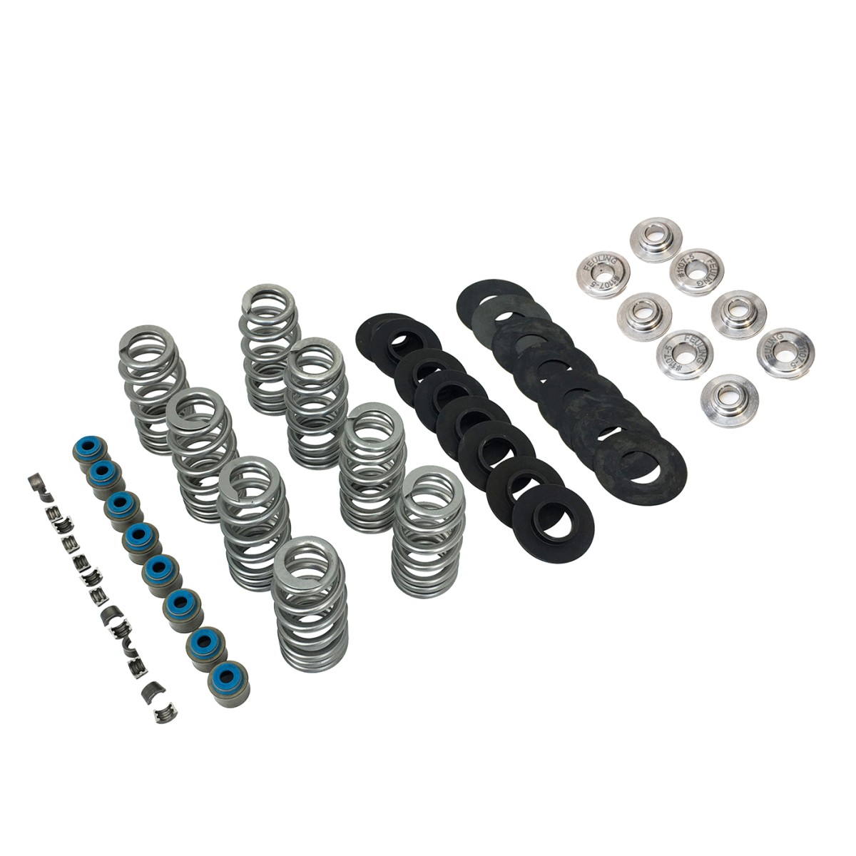 Kits include: FEULING® ENDURACE BEEHIVE® valve springs, Ti retainers, machined spring seats, seat shims, valve locks and a set of premium Viton® valve seals equipped with a spring loaded valve stem wiper system.