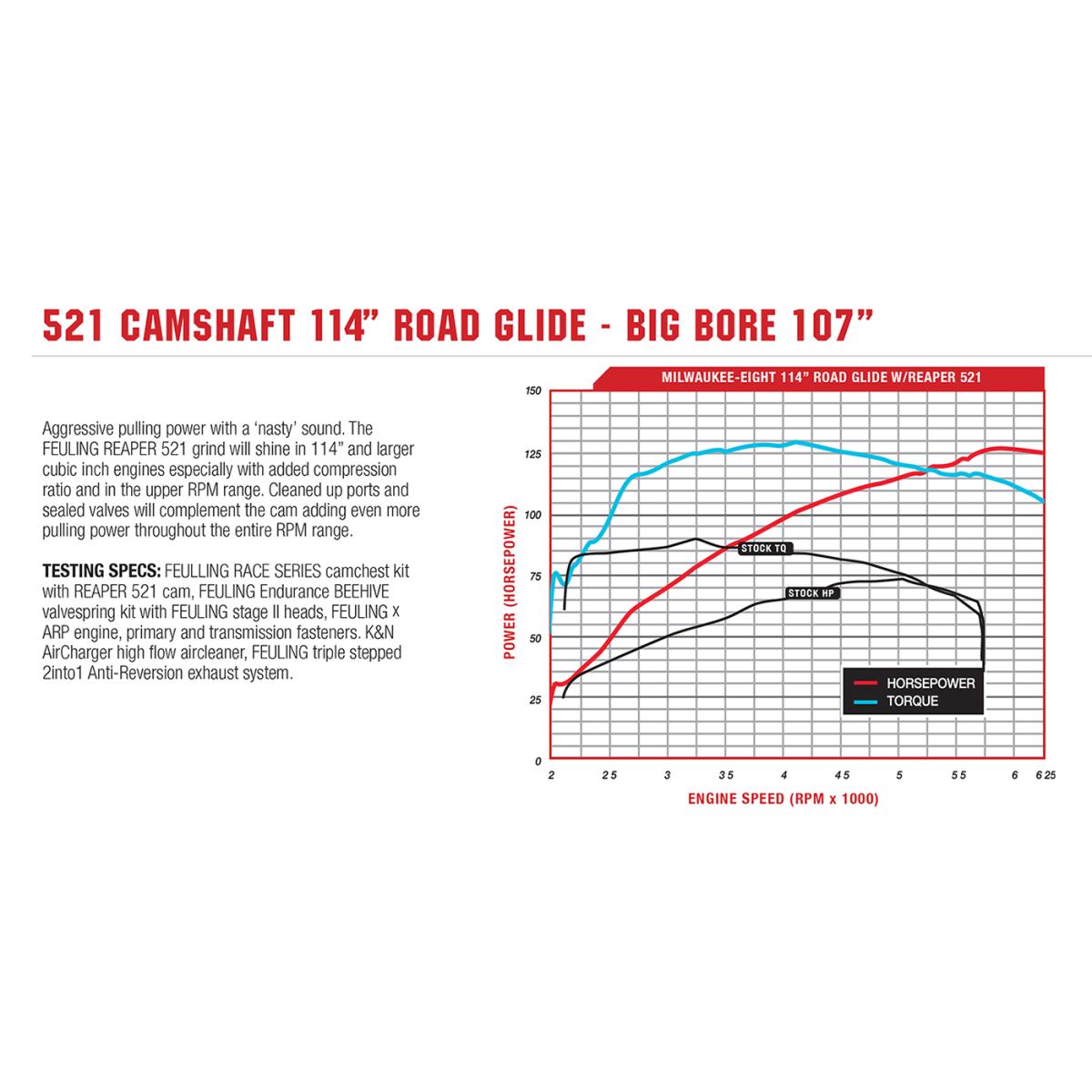 521 CAM - Aggressive pulling power with a nasty sound, the REAPER 521 grind will shine in 114 and larger cubic inch engines with added compression ratio. Ported cylinder heads are not required but will complement the cam and add even more pulling power throughout the range. The stock throttle body produces an excellent powerband and use of a high flow throttle body will increase peak power numbers. A high flow exhaust system and air cleaner is highly recommended for optimal performance. FEULING recommends matching this cam with our RACE SERIES oiling system.