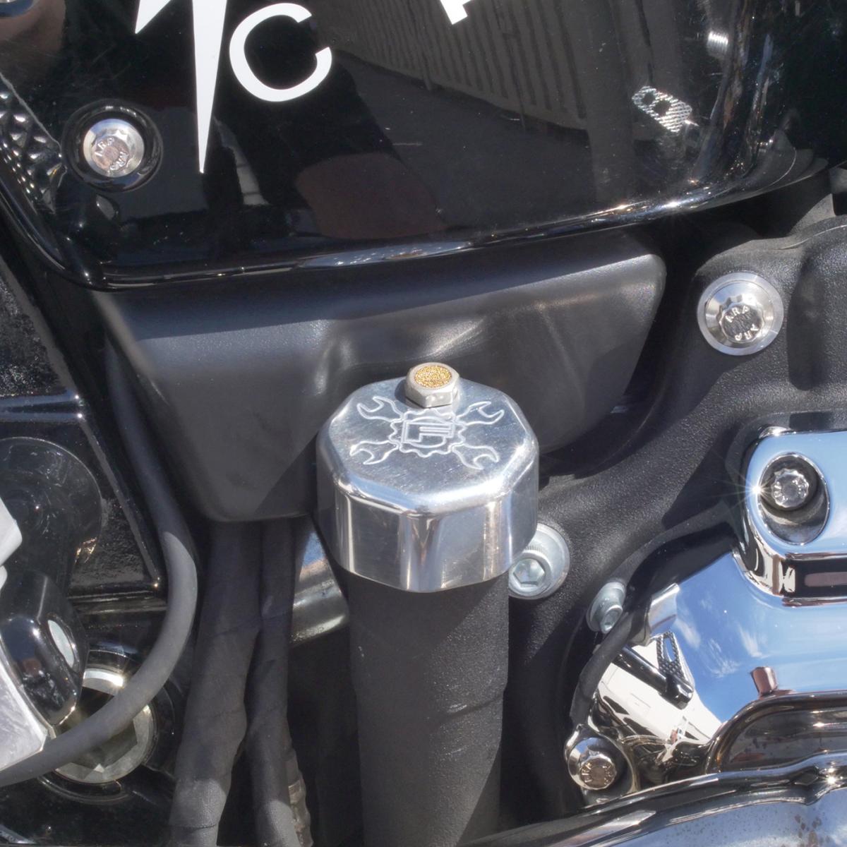 The FEULING billet dipsticks vent/breathe excessive crank case pressure from the oil tank through a PCV style breather, consisting of an oil separator system, perforated disc, replaceable filter element and umbrella flapper valve. Feuling vented dipsticks screw into the factory oil fill spout as a stock replacement part. These breathing dipsticks remove unwanted build-up of blow by pressure in the oil tank.