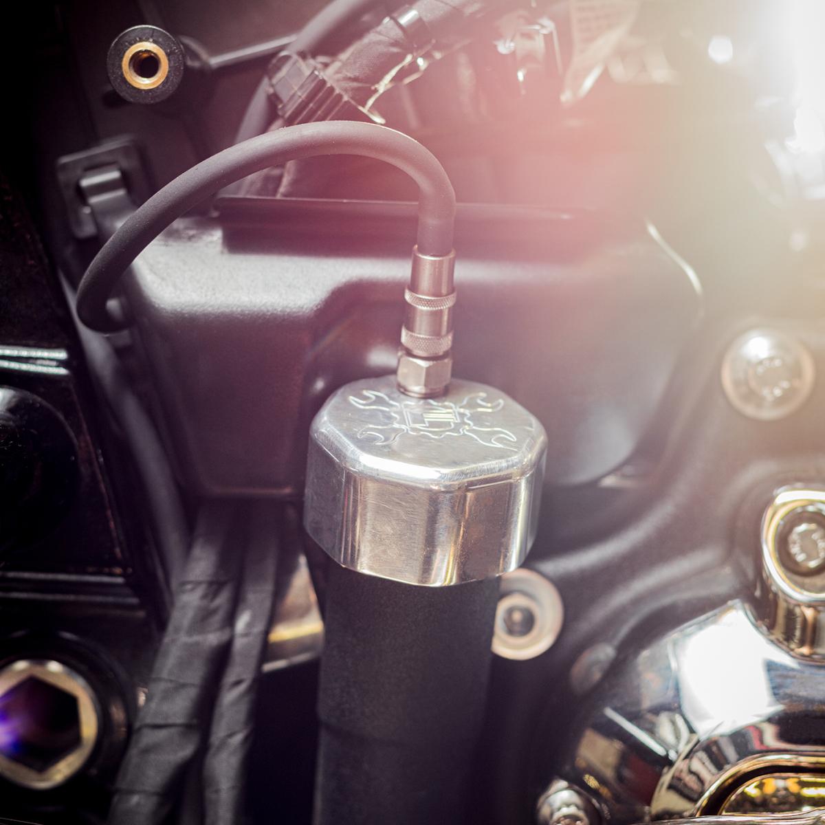 Note: The oil pick up port is on the right side of the engine. Letting the bike idle or warm up on the kickstand will naturally fill the engine case and skew the oil level in the tank.