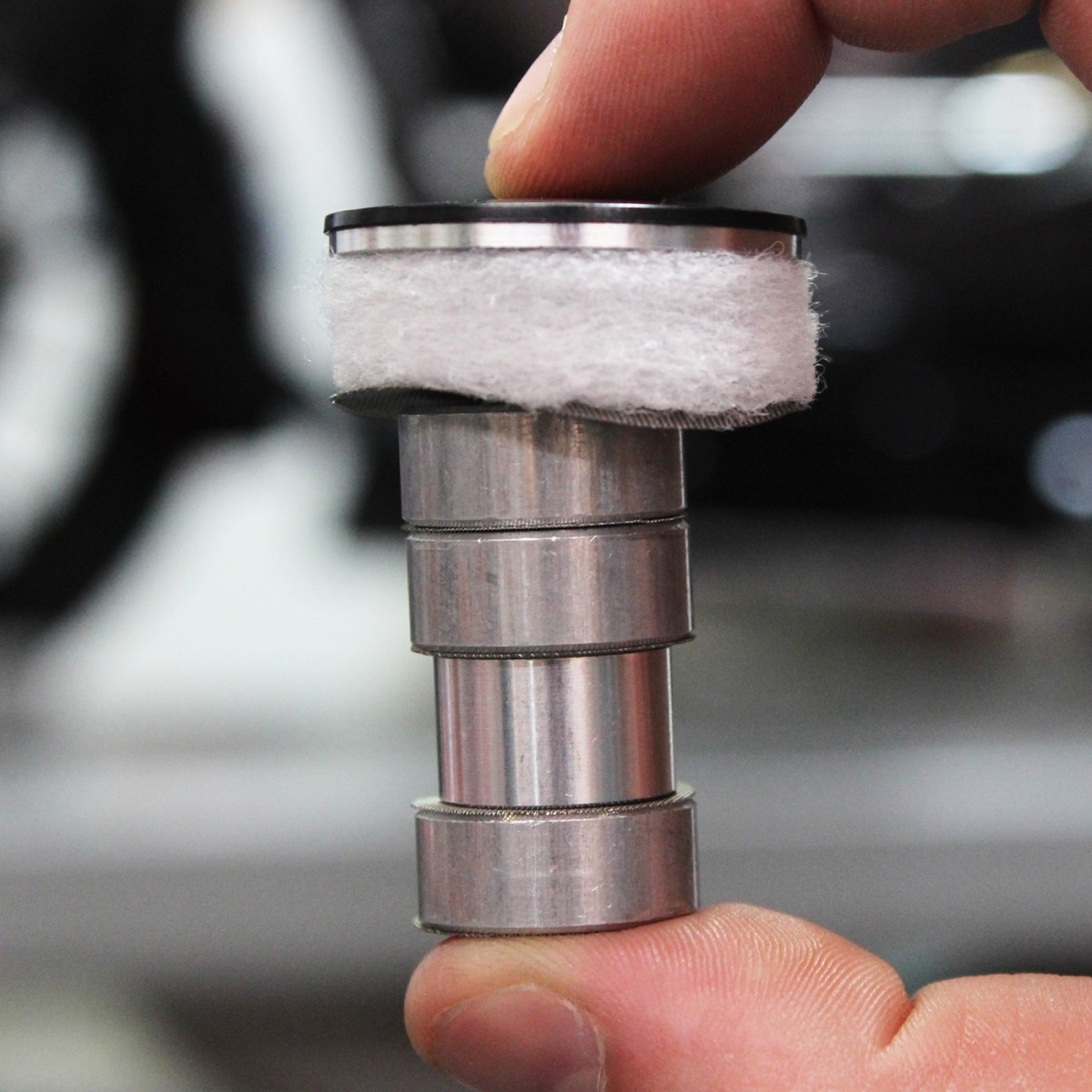 Softail Dipstick oil separator: The oil separator inserts into the inner dipstick housing bore, alternating the ¾” OD perforated screens and spacers then the large perf screen, filter, aluminum perforated disc then umbrella valve. The smaller diameter spacer is the 2nd from bottom, the umbrella valve sits on top.