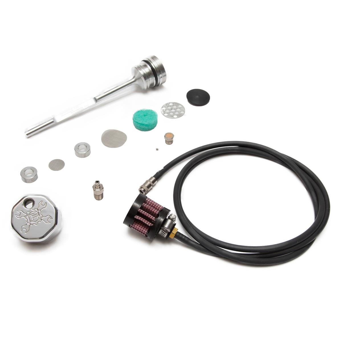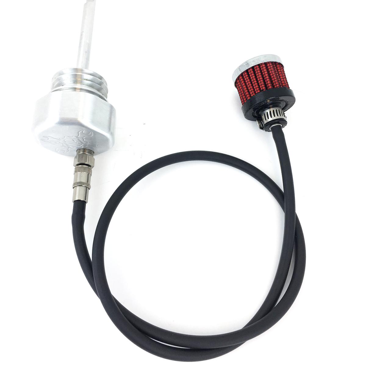 The FEULING billet dipsticks vent/breathe excessive crank case pressure from the oil tank through a PCV style breather, consisting of an oil separator system, perforated disc, replaceable filter element and umbrella flapper valve. Feuling vented dipsticks screw into the factory oil fill spout as a stock replacement part. These breathing dipsticks remove unwanted build-up of blow by pressure in the oil tank.