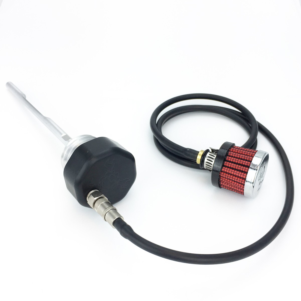 OPTION 2.) Quick disconnect coupler fitting with rubber hose and filter element. This option will run any excessive oil misting/residue through the line and into the filter element. However this option does requires disconnecting the fitting in order to check the oil. This is Feuling's preferred option as it breaths more than option 1.