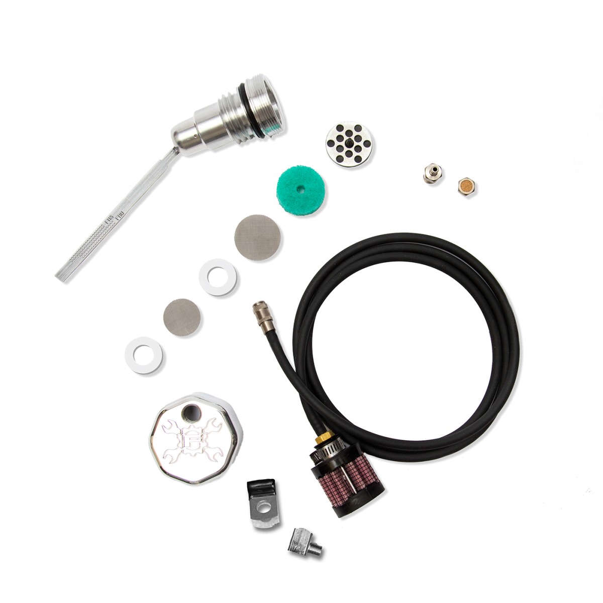OPTION 2.) Quick disconnect coupler fitting with rubber hose and filter element. This option will run any excessive oil misting/residue through the line and into the filter element. However this option does requires disconnecting the fitting in order to check the oil. This is Feuling's preferred option as it breaths more than option 1.