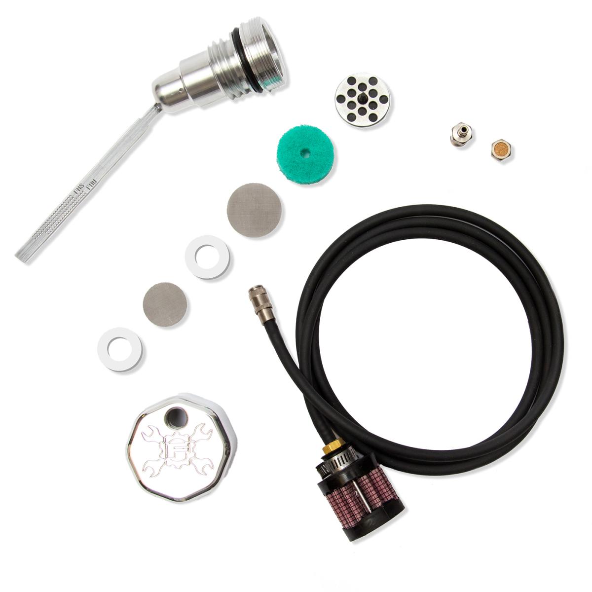 OPTION 2.) Quick disconnect coupler fitting with rubber hose and filter element. This option will run any excessive oil misting/residue through the line and into the filter element. However this option does requires disconnecting the fitting in order to check the oil. This is Feulings preferred option as it breaths more than option 1.
