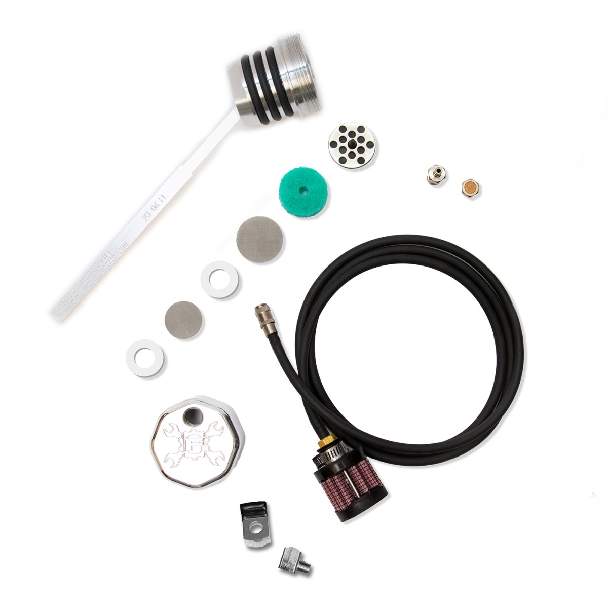 OPTION 2.) Quick disconnect coupler fitting with rubber hose and filter element. This option will run any excessive oil misting/residue through the line and into the filter element. However this option does requires disconnecting the fitting in order to check the oil. This is Feuling's preferred option as it breaths more than option 1.