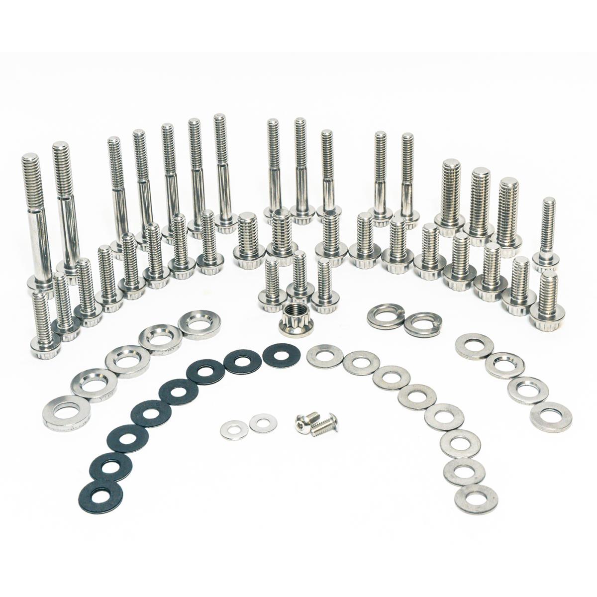 Complete External Engine Fastener kit - ROCKER COVER, LIFTER BLOCK, FRONT ENGINE MOUNT, FRONT ENGINE MOUNT NUT, CASE BOLTS, RIGHT SIDE ENGINE COVER, CENTER ENGINE/CHOKE MOUNT, TIMING COVER, ¼ WASHERS, 3/8 HD WASHERS, 5/16 WASHERS, 3/8 LOCK WASHERS