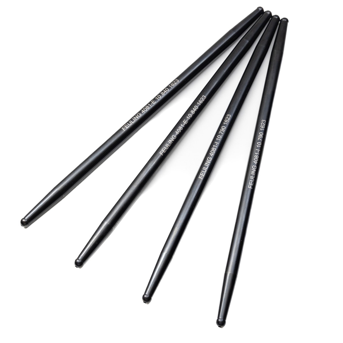 Fixed Length 4130 Chrome moly one piece pushrods with swedged formed ends. Heavy duty 7/16" diameter tube with 0.165" wall thickness, precision concentricity, heat treated with a black oxide finish. Intake and Exhaust pushrods are 0.040" longer than stock and are designed to work with Feuling 580 camshafts and other smaller base circle camshafts.