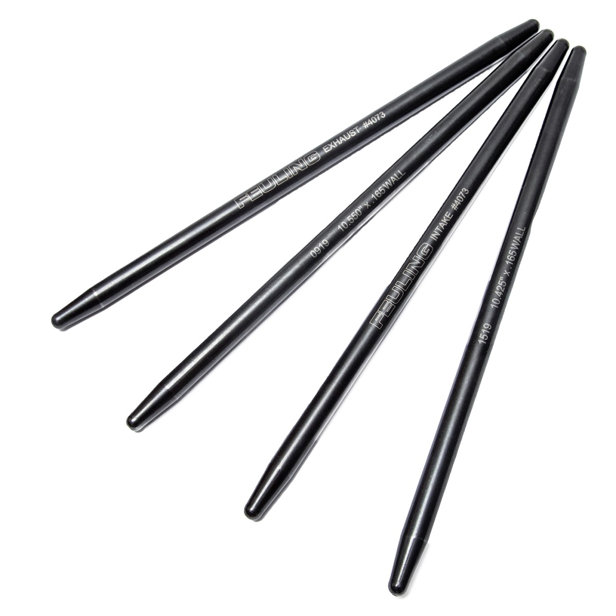 Fixed Length 4130 Chrome moly one piece pushrods with swedged formed ends. Heavy duty 7/16" diameter tube with 0.165" wall thickness, precision concentricity, heat treated with a black oxide finish. Intake and Exhaust pushrods are designed to work with the Feuling 518 cam grind. These pushrods work with Feuling® 518 EVO cam grind (Part #1390). Lengths: Front Intake - 11.050", Rear Intake - 11.015", Front Exhaust - 11.300", Rear Exhaust - 11.200"