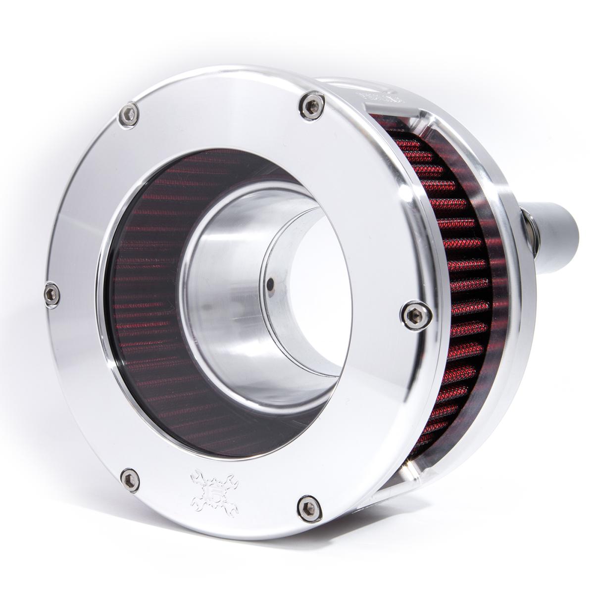 Available in raw, black, or chrome finish, solid or clear cover and red or black filter element.