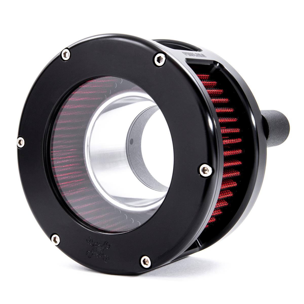 Available in raw, black, or chrome finish, solid or clear cover and red or black filter element.