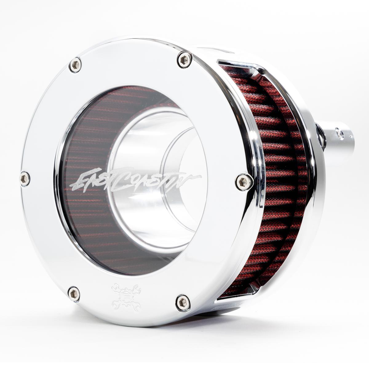 Available in raw, black, or chrome finish, solid or clear cover and red or black filter element.