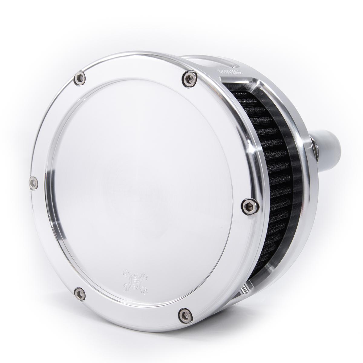 Available in raw, black, or chrome finish, solid or clear cover and red or black filter element.
