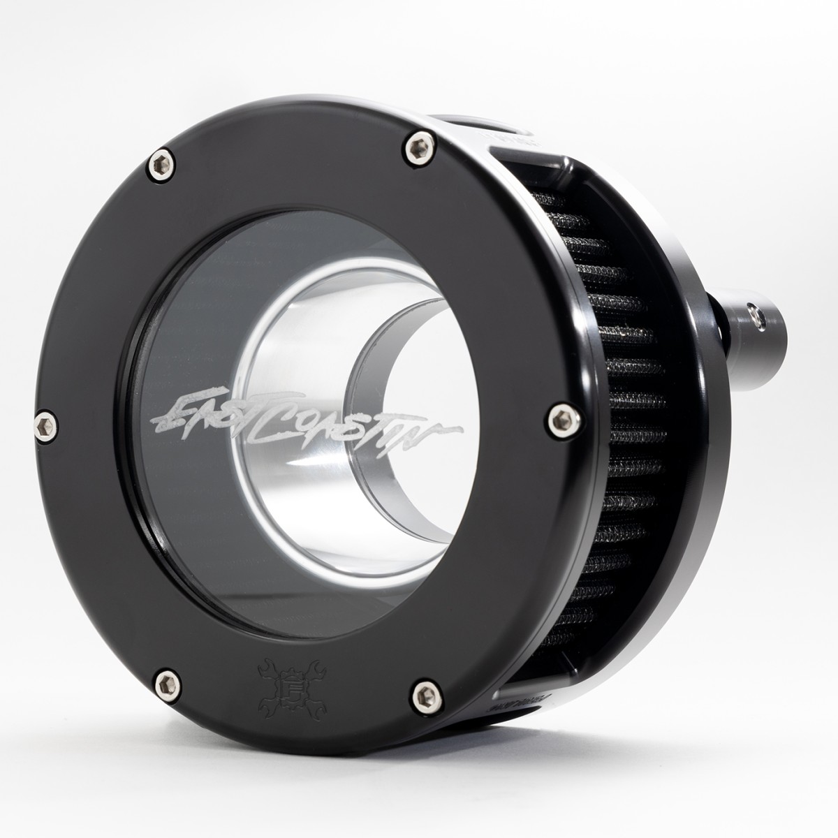 Available in raw, black, or chrome finish, solid or clear cover and red or black filter element.