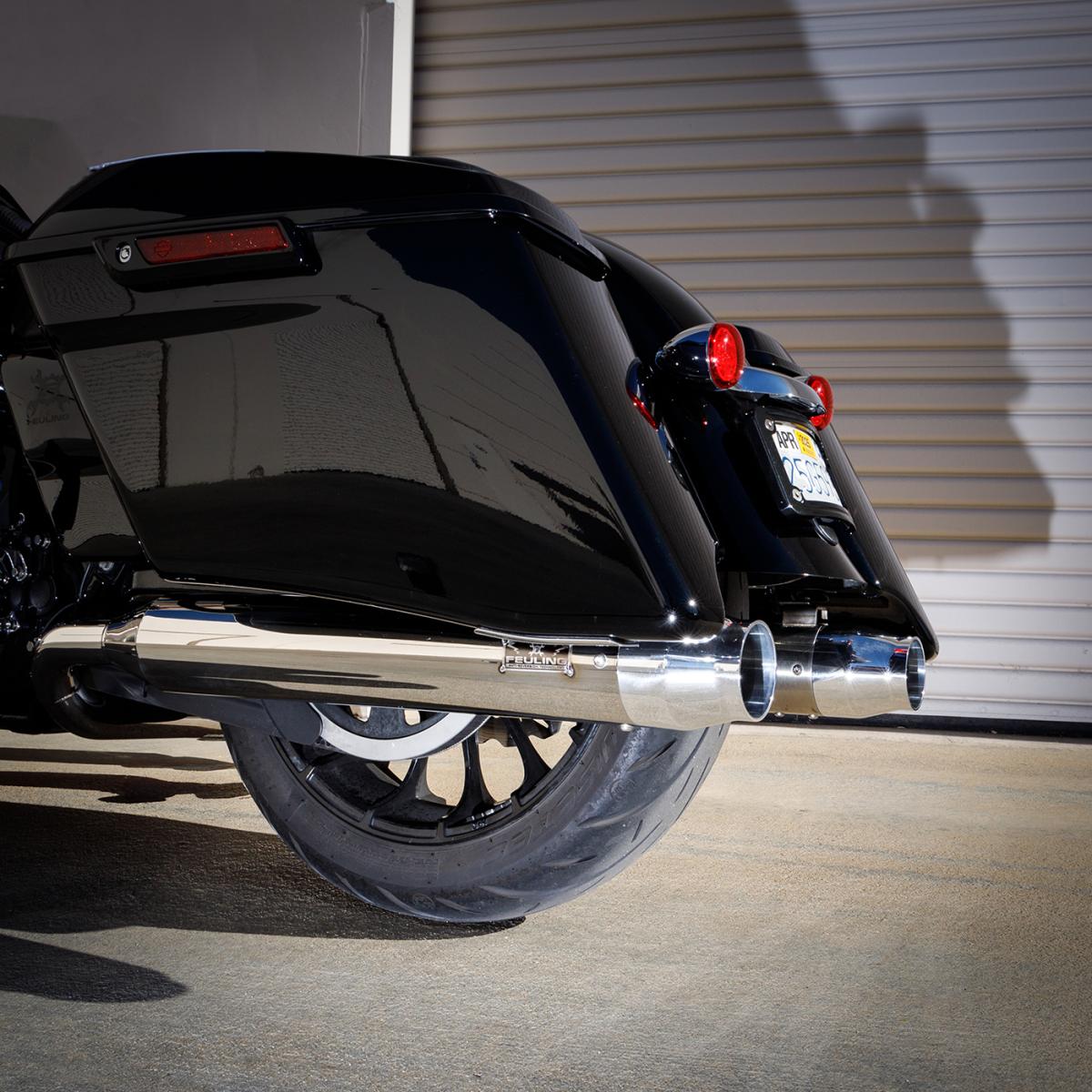 Stainless left side Pseudo pipe for use with 2 into 1 system, normal length exhaust with end cap sticking out past saddlebags, works with both extended and standard HD saddlebags. Matches systems #5900, 5902, 5909 show polish finish.