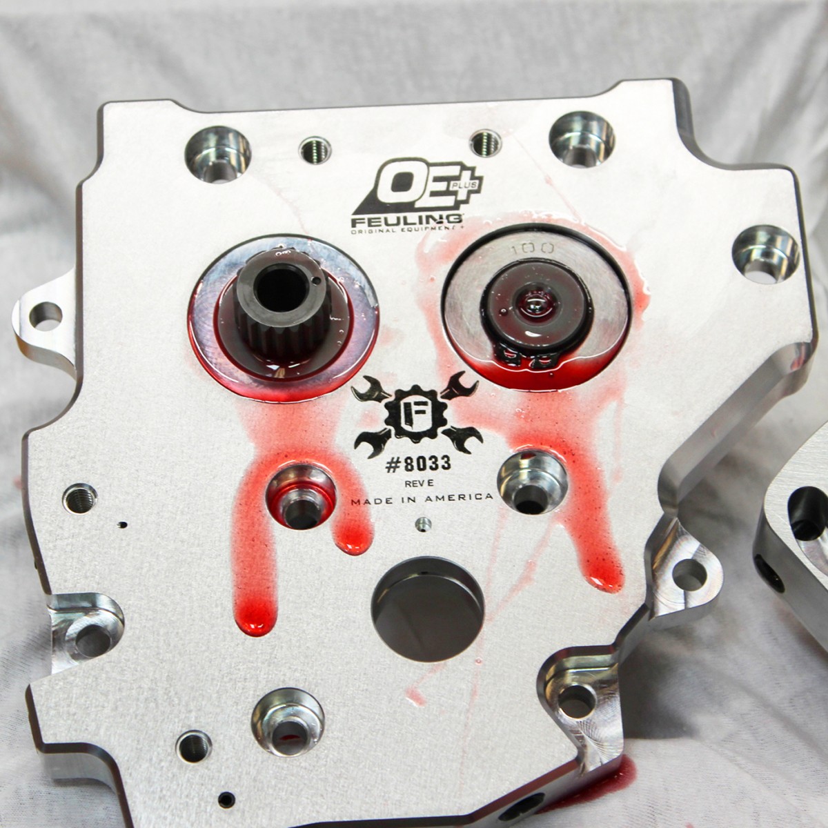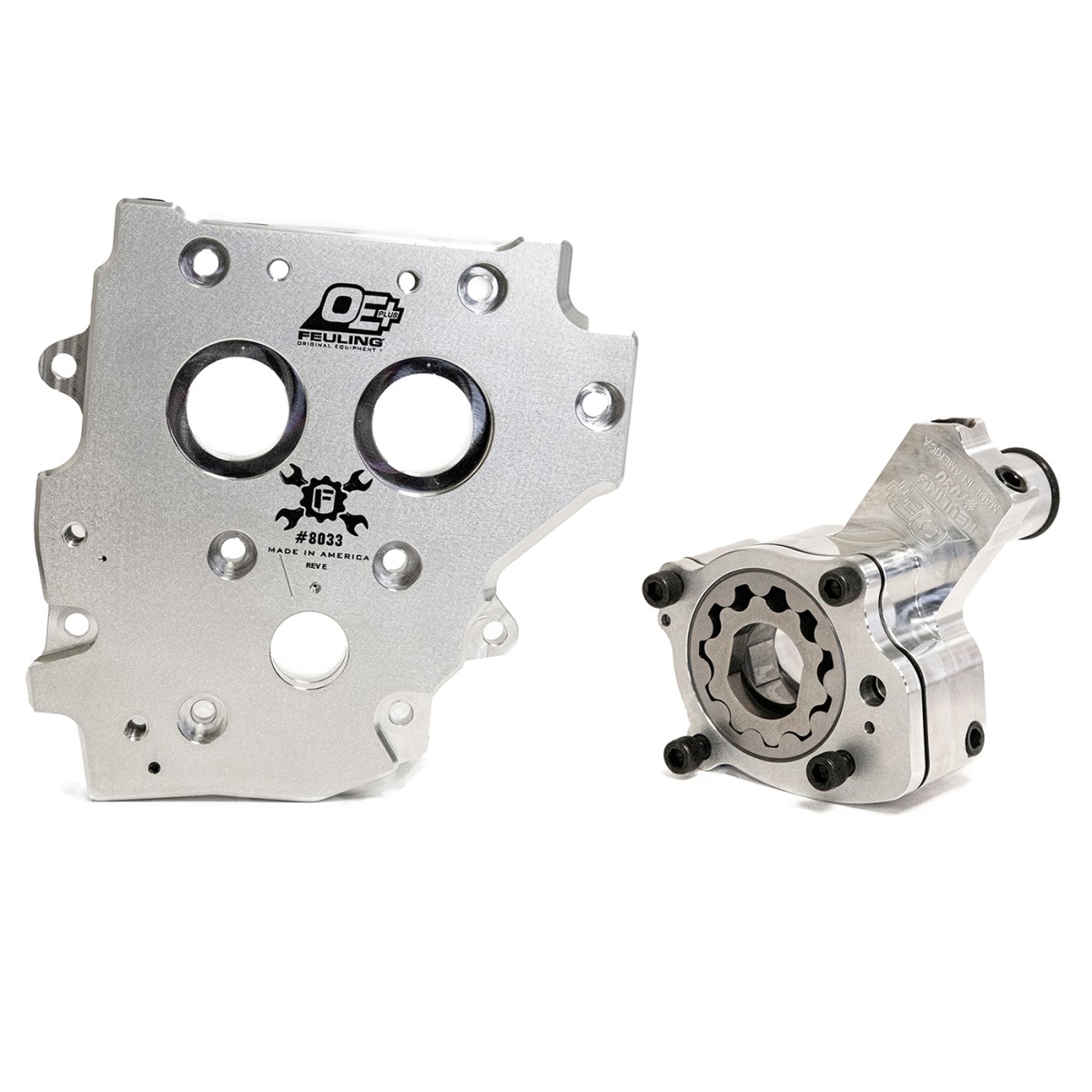 FEULING® OE+ oil pump and camplate kits are an upgrade to the stock oiling system, delivering increased oil pressure and return scavenge volumes from an OE+ billet oil pump and matched OE+ billet camplate. The OE+ billet camplates have increased rigidity and are machined to tighter tolerances compared to stock. The OE+ camplate pressure relief valve and spring are seated and pre-set with a 50-60 psi pop off.