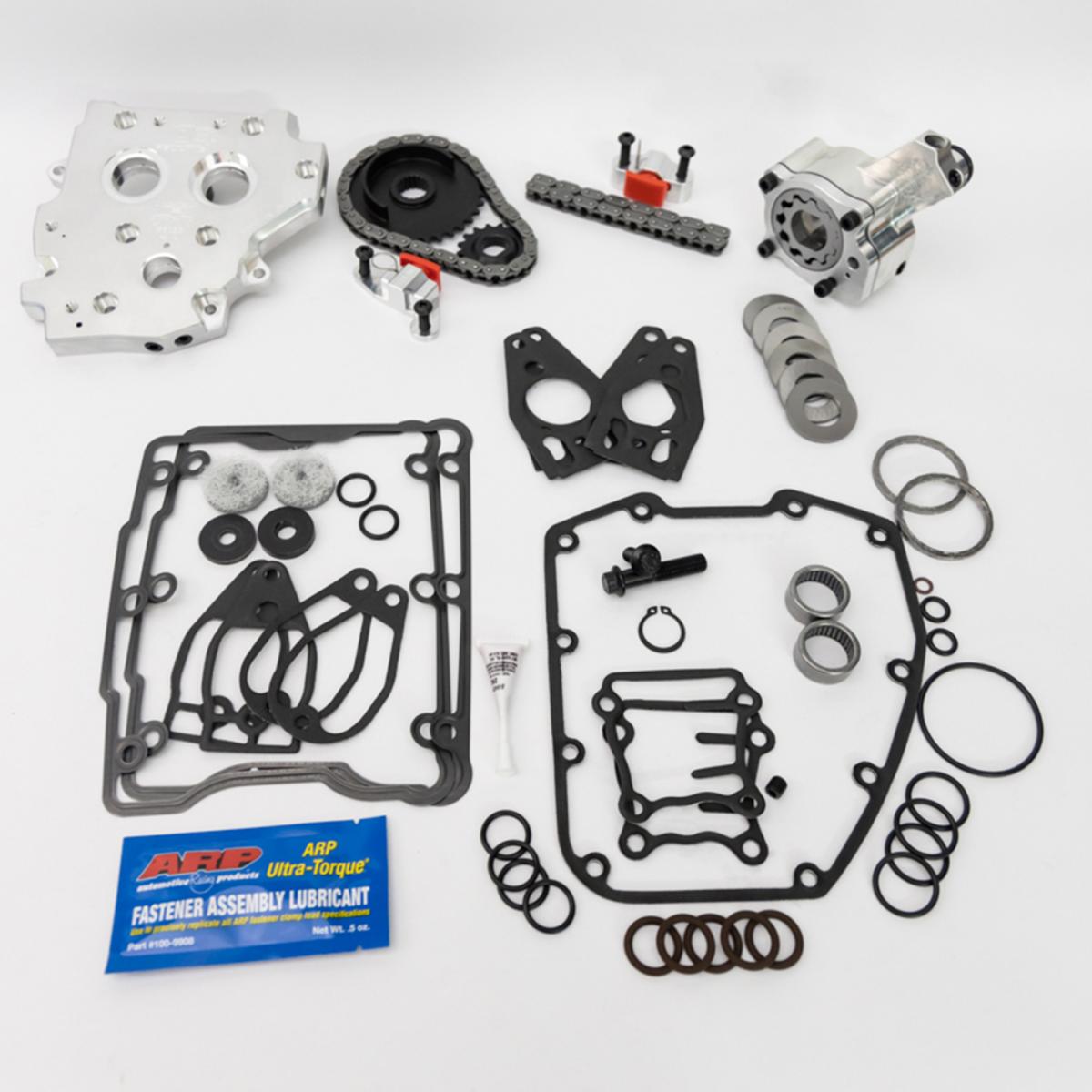 Kit includes the needed components to upgrade early 99-06 style mechanical spring tensioner cam chain drive systems to the late 07-17 hydraulic cam chain drive system using hybrid camshafts. This kit includes a FEULING OE+ billet oil pump and camplate, FEULINGS billet hydraulic tensioner housings, tensioner pads, cam chains, sprockets, sprocket alignment spacers, TIMKEN/FEULING bearings, needed gaskets, O-rings, ARP cam and crank hardware, Loctite and moly lube. Requires purchase of conversion style camshafts.