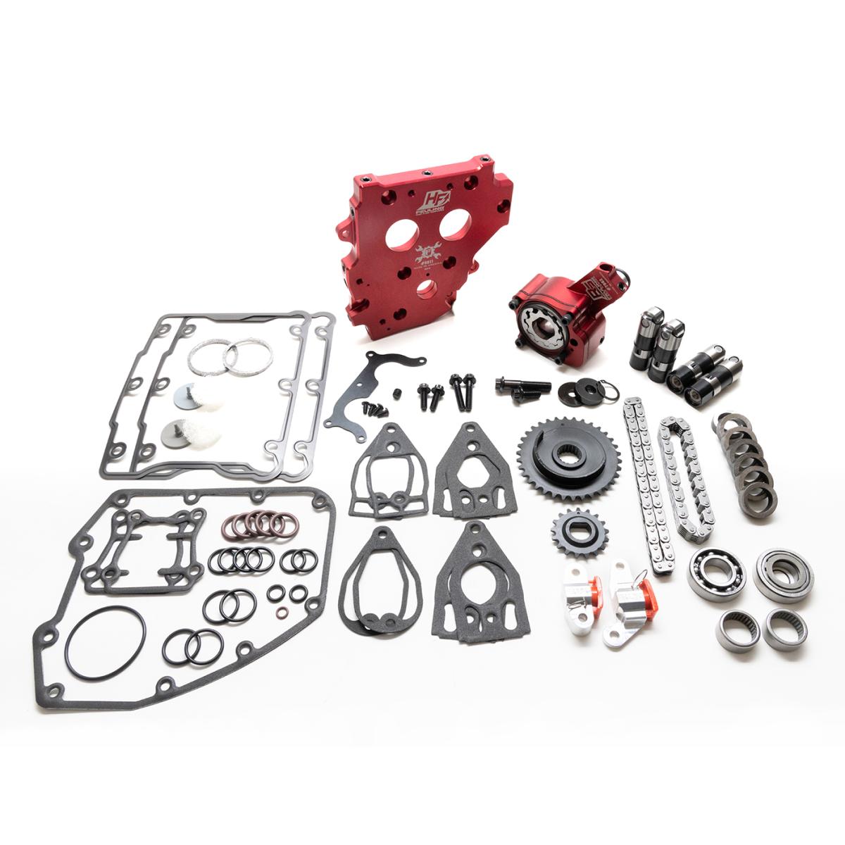 Kit includes the needed components to upgrade early 99-06 style mechanical spring tensioner cam chain drive systems to the late 07-17 hydraulic cam chain drive system using a hybrid camplate. This kit includes a FEULING RACE SERIES billet oil pump, High Flow camplate, RACE SERIES full travel lifters, FEULINGS billet hydraulic tensioner housings, tensioner pads, cam chains, sprockets, sprocket alignment spacers, TIMKEN/FEULING bearings, needed gaskets, O-rings, ARP cam and crank hardware, Loctite and moly lube.