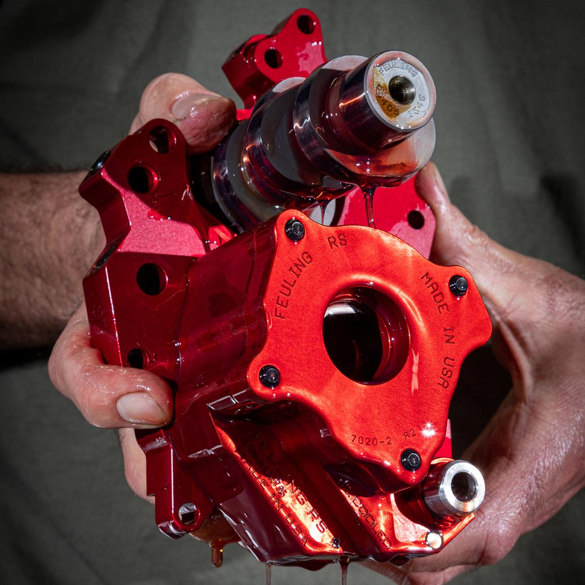 Billet 7075 aluminum oil pump which is 50% harder and stronger than the factory pump holding tighter tolerances under temperature, deeper scavenge kidneys over HP+ oil pump.