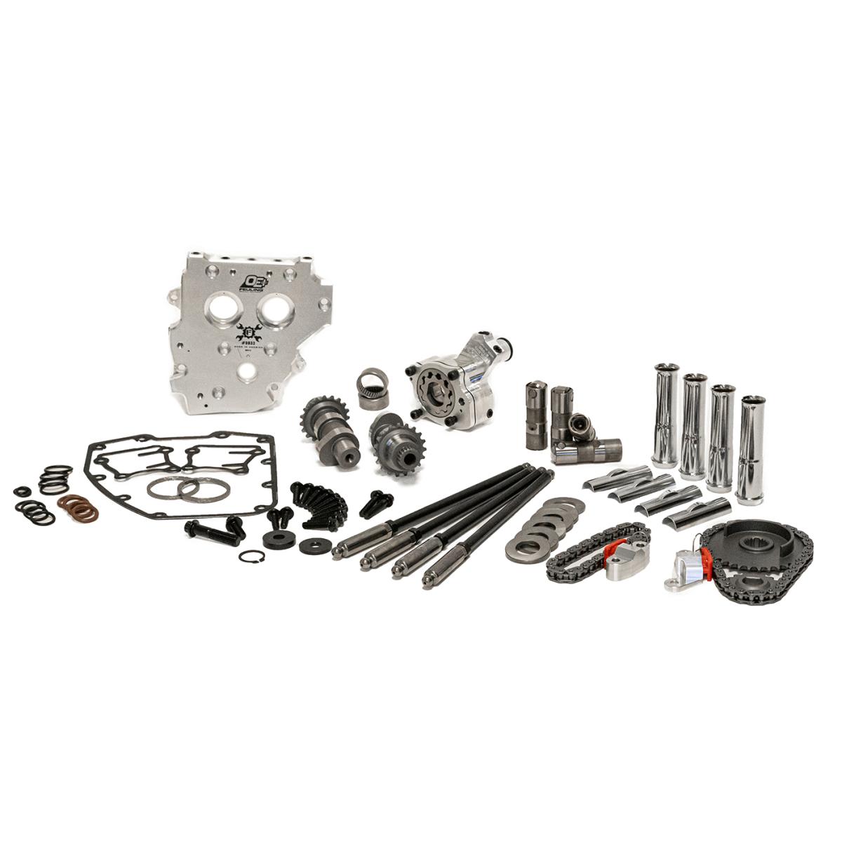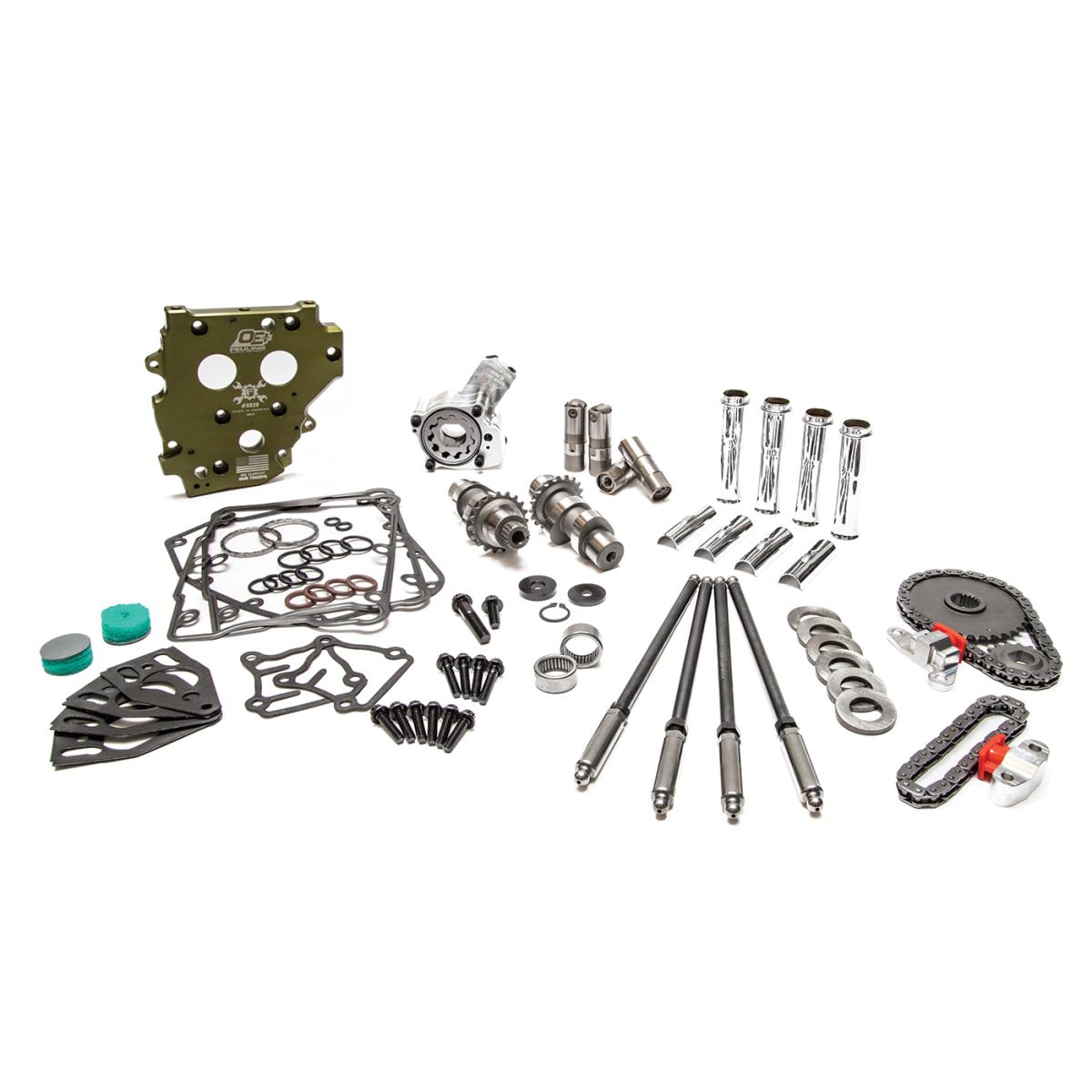 OE+ conversion complete Camchest Kits include: FEULING OE+ Oil pump, OE+ Camplate, REAPER Series Conversion Camshafts, HP+ hydraulic roller lifters, Quick install adjustable pushrods, pushrod tubes, sprockets, cam chains, sprocket spacers, Timken Bearings, Gaskets, O-rings, Exhaust gaskets, ARP fasteners, washers, moly paste, Loctite, and hardware.