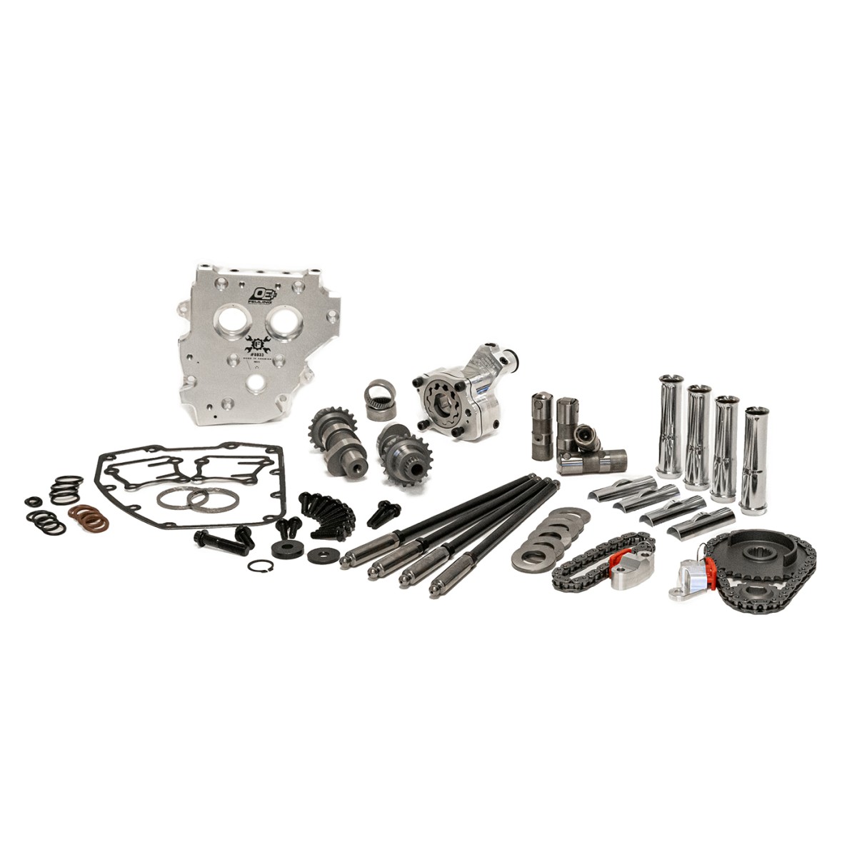 OE+ conversion complete Camchest Kits include: FEULING® OE+ Oil pump, OE+ Camplate, REAPER® Series Conversion Camshafts, HP+ hydraulic roller lifters, Quick install adjustable pushrods, pushrod tubes, sprockets, cam chains, sprocket spacers, Timken® Bearings, Gaskets, O-rings, Exhaust gaskets, ARP® fasteners, washers, moly paste, Loctite®, and hardware.