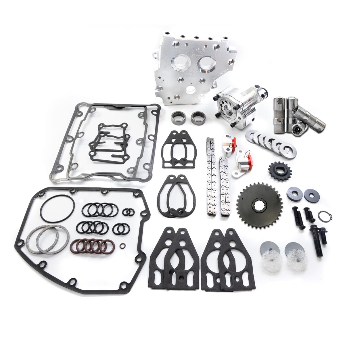 Freshen up your camchest and oiling system on late model Twin Cam engines. This kit uses your existing camshafts or allows purchase of your preferred cam selection while upgrading your camchest with a new OE+ high volume oil pump, OE+ camplate, HP+ lifters, billet tensioner housings, tensioner pads, cam/crank sprockets, sprocket alignment spacers, cam chains, cam bearings, hardware, gaskets, O-rings.