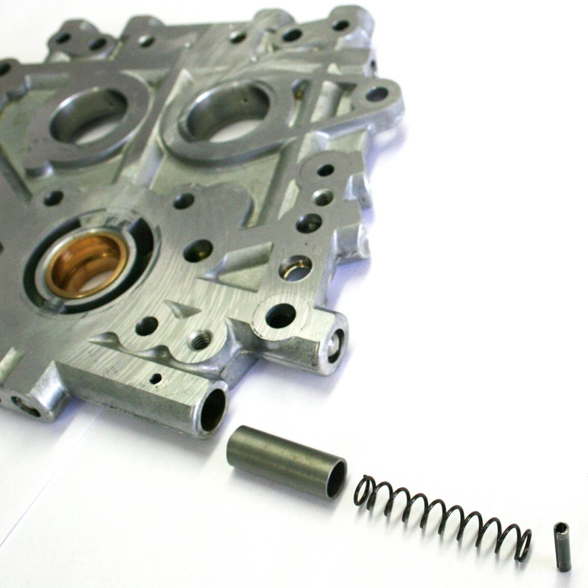 FEULING® camplate pressure relief valve plunger, spring & roll pin. Increase the pressure relief valve pop off PSI with the Feuling spring, bench testing recommended with FEULING® camplate pressure test tool #9010 to ensure proper valve seal and valve operation.