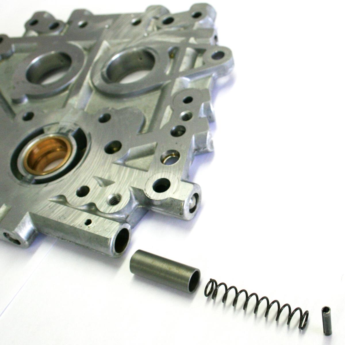 FEULING camplate pressure relief valve plunger, spring & roll pin. Increase the pressure relief valve pop off PSI with the Feuling spring, bench testing recommended with FEULING camplate pressure test tool #9010 to ensure proper valve seal and valve operation.