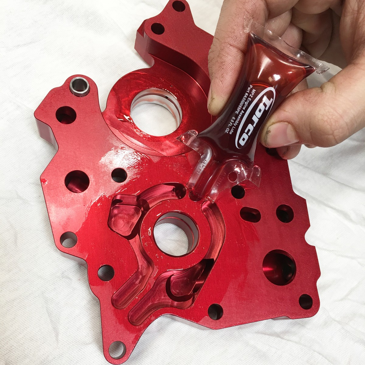 • Increase engine oil flow and volume by enlarging the oil pump reservoirs and critical oil passages including the scavenge return holes from the pump to the camplate and into the engine case. This camplate also matches the oil port holes throughout the camplate to the port holes in the engine case increasing engine oil flow throughout the engine.