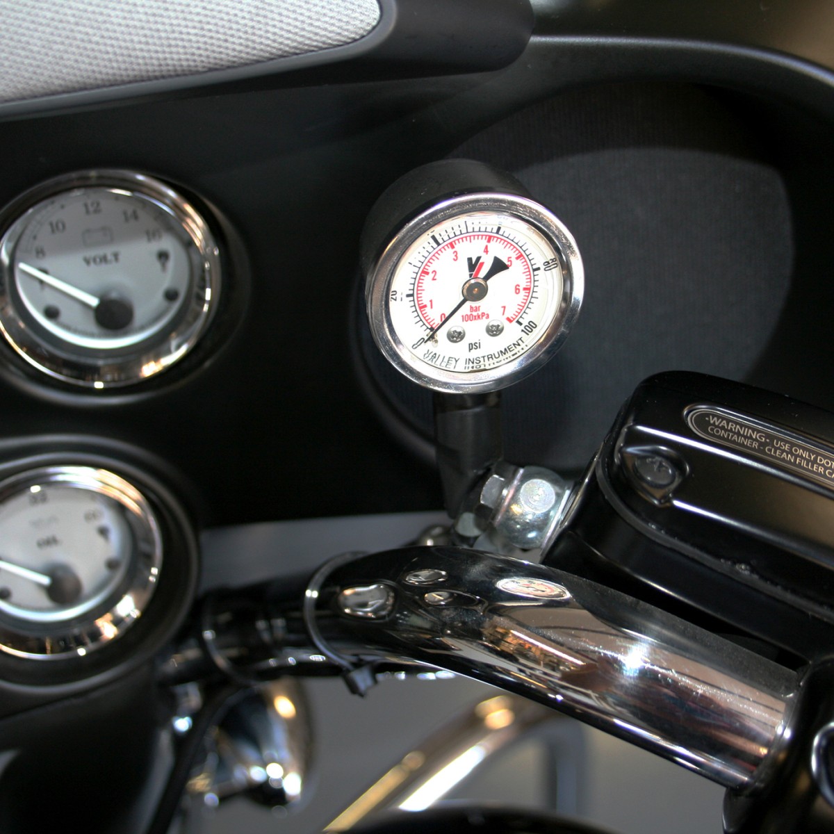 Kit includes all needed fittings to hook up on an XL, EVO, Twin Cam & M8 engines. Line is 45" OAL. Hooks up to existing oil psi ascending unit port, oil line routes up the right side frame rail, gauge fastens to the handlebars using zipeties and spacers. If a billet clamp is desired for a more permanent mount option, see gauge mounts #9050, #9051, #9052, #9053, #9055, #9056, #9057 or #9058.