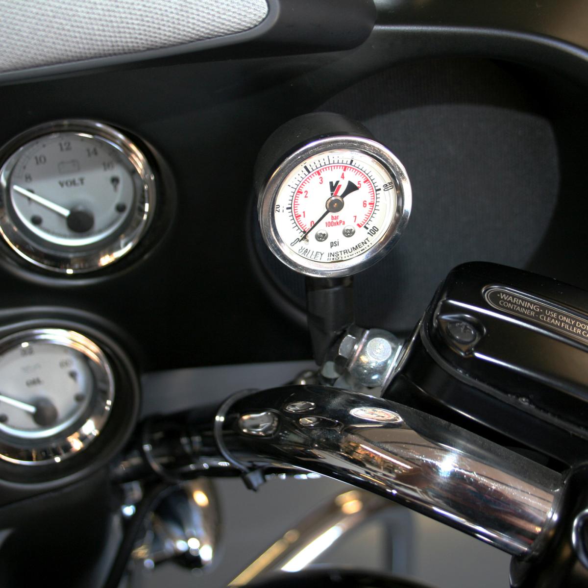 Hooks up to existing oil psi ascending unit port, oil line routes up the right side frame rail, gauge fastens to the handlebars near the master cylinder. Fits all models