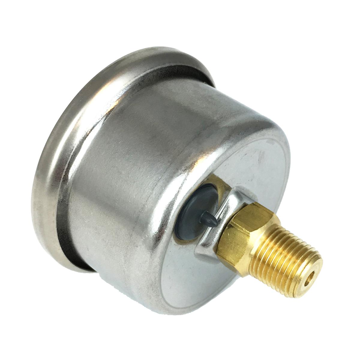Quality liquid Silicone filled pressure gauge 1.5 dial with 0-100 range, stainless steel case with white or black dial face, glass cover, brass 1/8 NPT male bottom or back port. Gauges with 80% liquid filled arrangement, accuracy 3-2-3%.