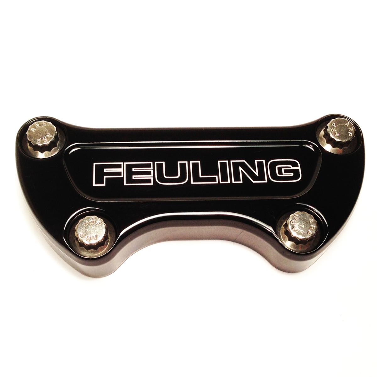 FEULING® logo handlebar top clamps, machined from billet 7050 aluminum, fits 1" bars includes 12 point stainless steel ARP® fasteners. Fits most '84-'17 models with 3 1/2" on center risers and offset mounting holes.