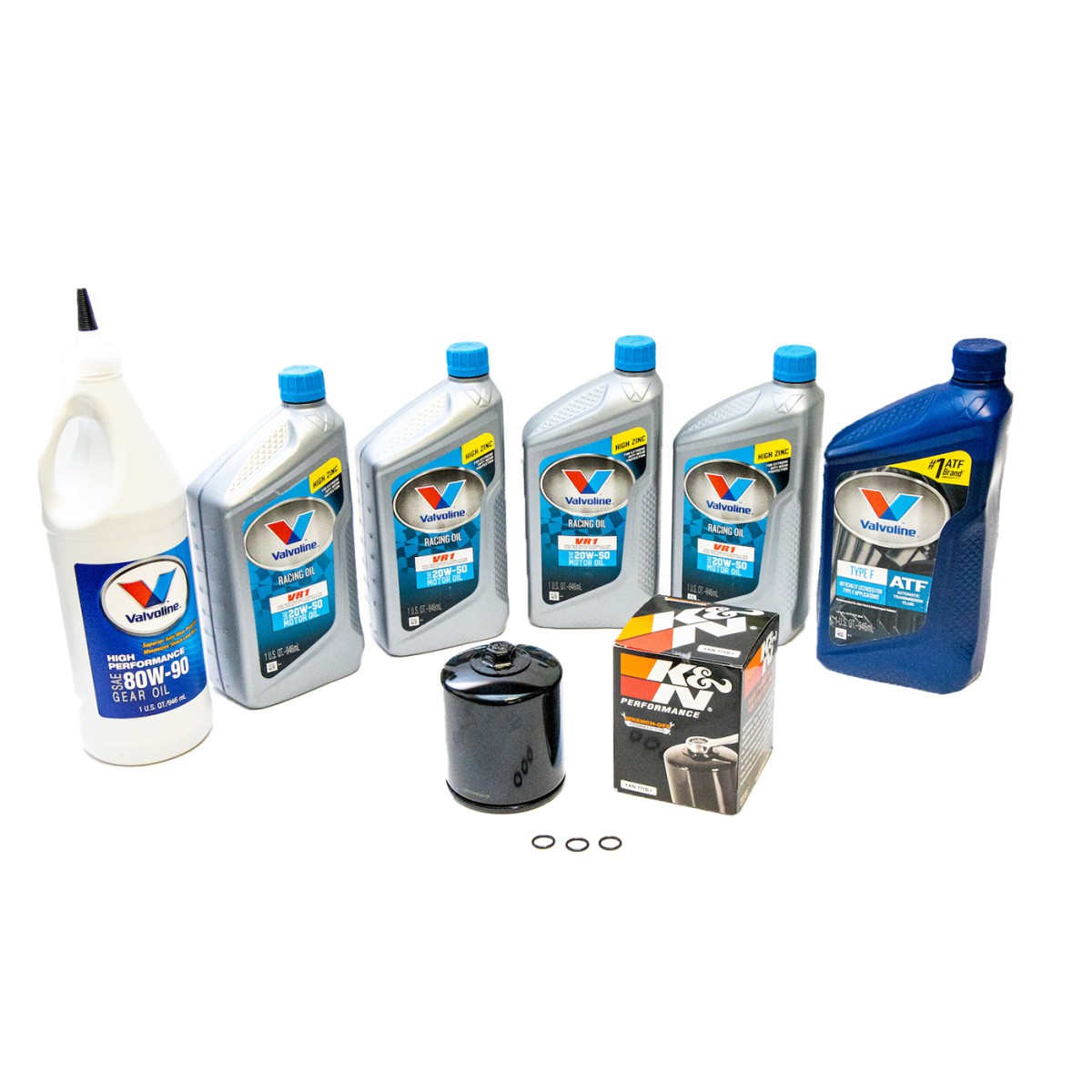 Complete Valvoline oil change kit, Engine oil, Transmission oil, Primary oil, K&N oil filter and drain plug O-rings